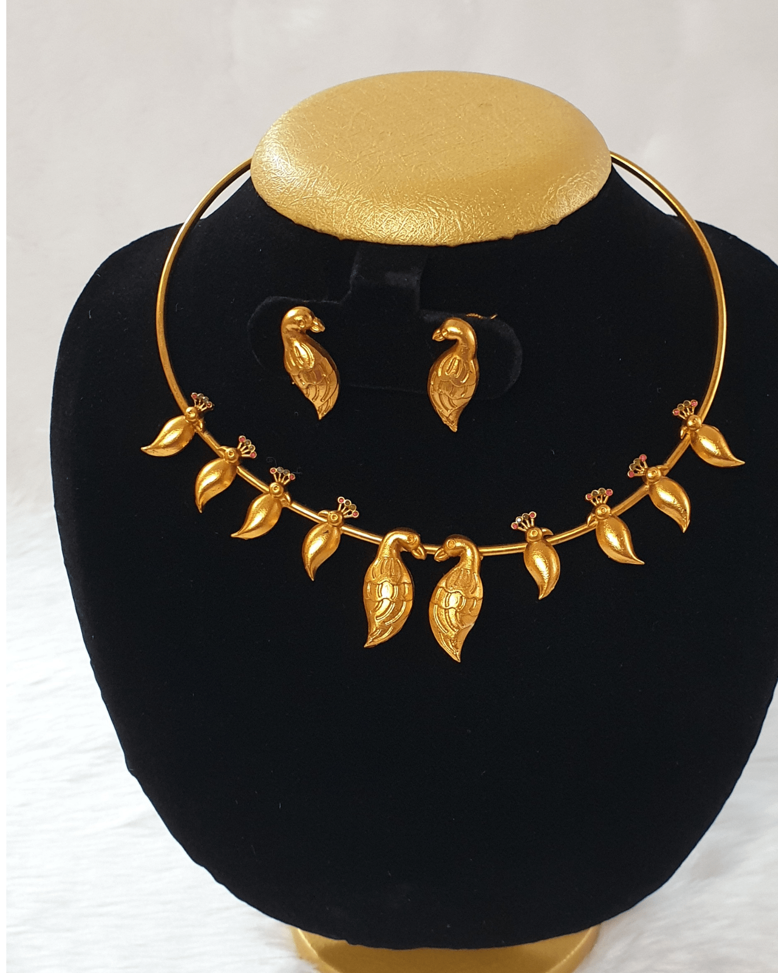 Designed in a luxurious matte gold finish, the hasli beautifully hugs the collarbone, adding a royal aura to both traditional and contemporary ethnic outfits. The detailed featherwork, antique polish, and traditional motifs make this a perfect choice for festive wear, weddings, or special pujas.