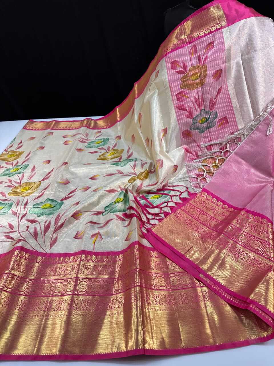 Bringing you an exquisite Banarasi Tissue Silk Saree, crafted to perfection with a soft and luxurious drape. The saree features a stunning hand-painted jaal design all over, adding artistic elegance and timeless charm. Paired with a contrast weaving Kanchi border, this masterpiece blends tradition with sophistication. The saree comes with a contrast blouse piece in a complementing shade, completing the regal look.