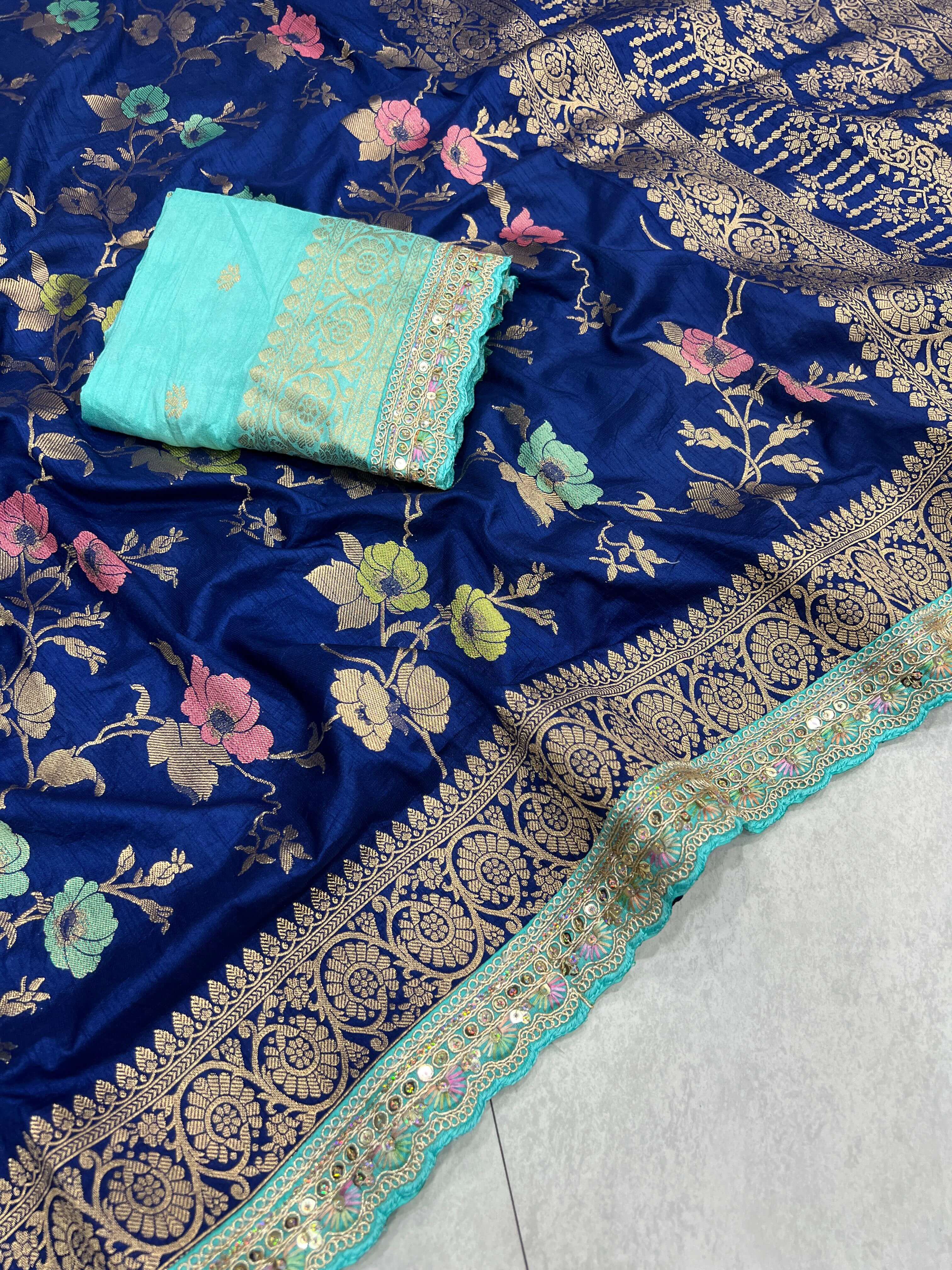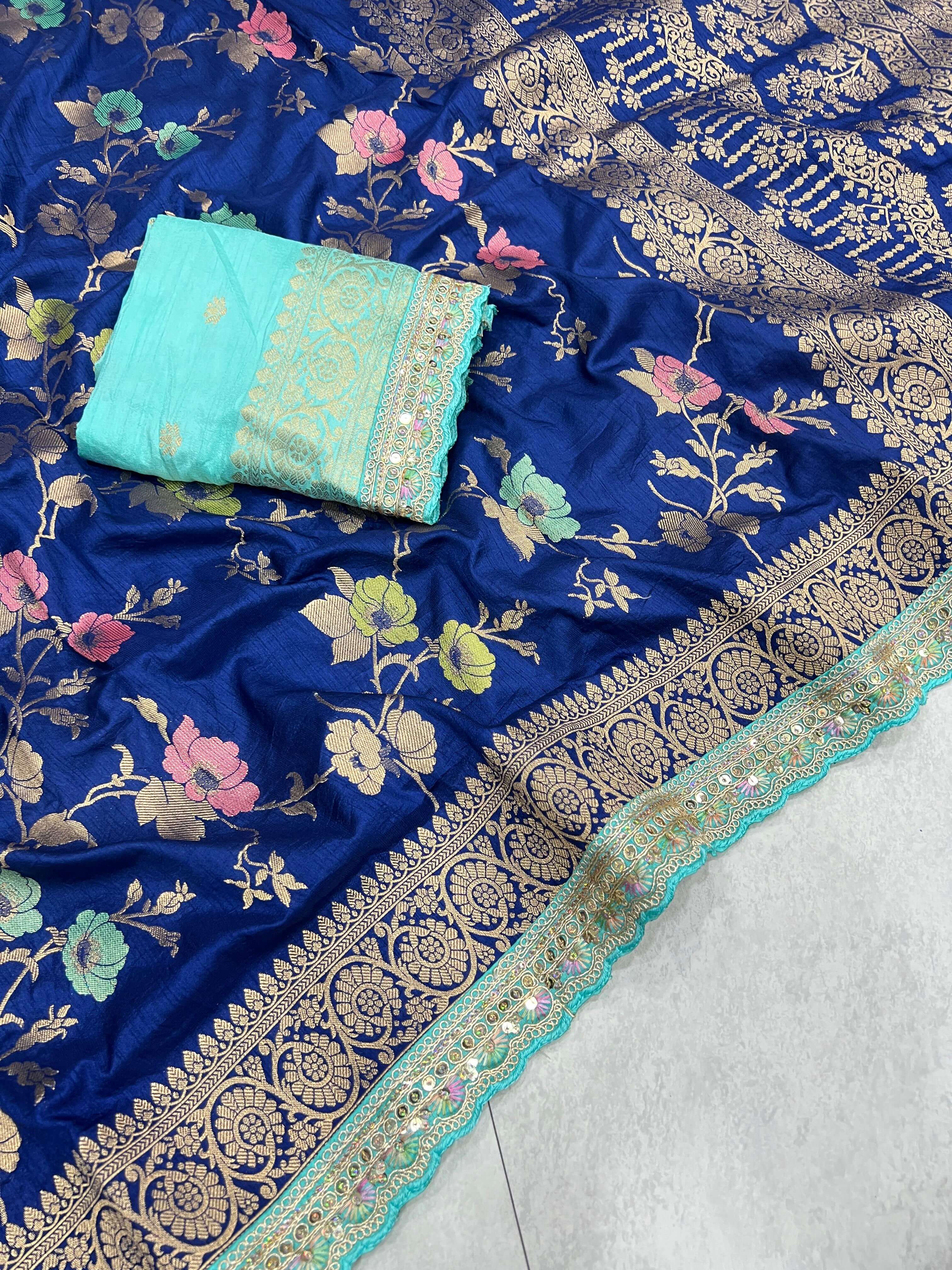 Experience timeless elegance with our luxurious Dola silk saree, crafted to perfection with rich meenakari and zari weaving. The highlight of this saree is its intricate embroidery cording, sequin, and thread work border, adding an enchanting touch of grace and grandeur. Perfect for weddings, festive celebrations, and special occasions, this saree blends traditional craftsmanship with modern finesse.
